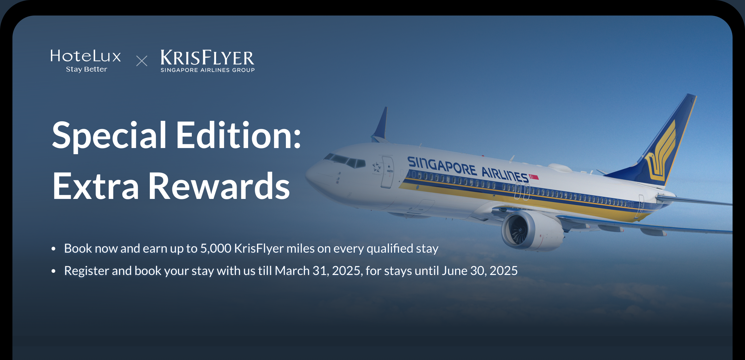 *Qualified Stay refers to all hotel stays that are booked via HoteLux App and that the hotel has Member Benefits on offer. For this campaign, the booking and stay period must also meet the promotional period requirements as stated in the Terms and Conditions to be eligible for this bonus miles campaign.